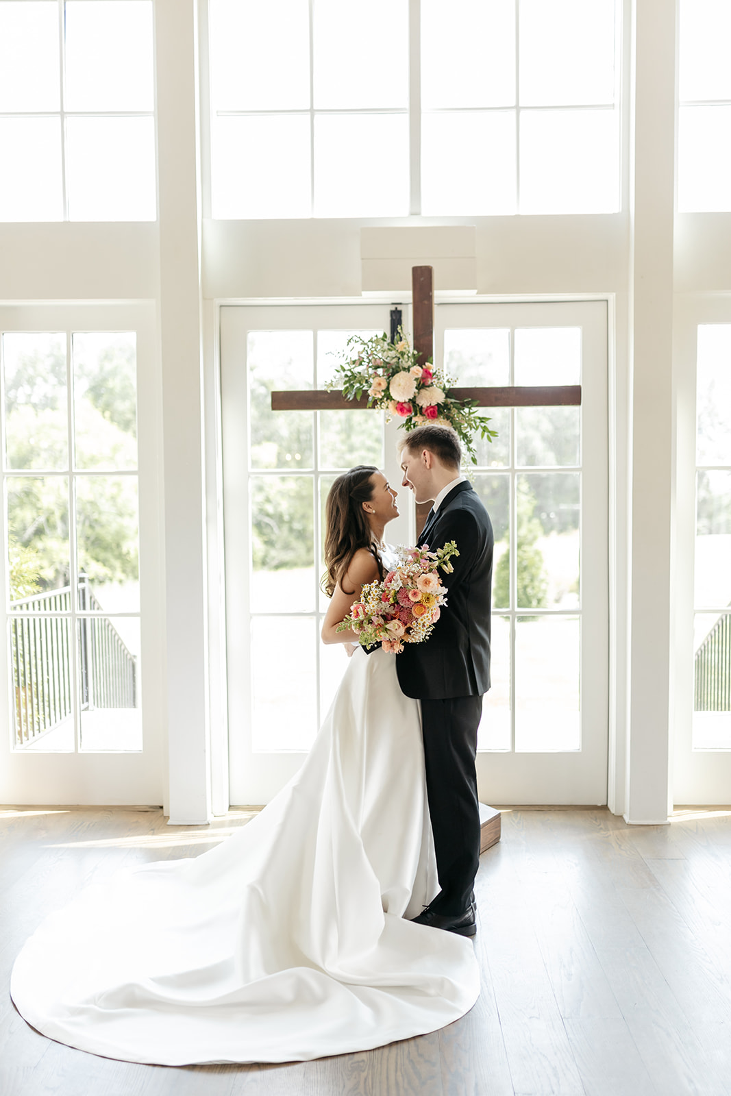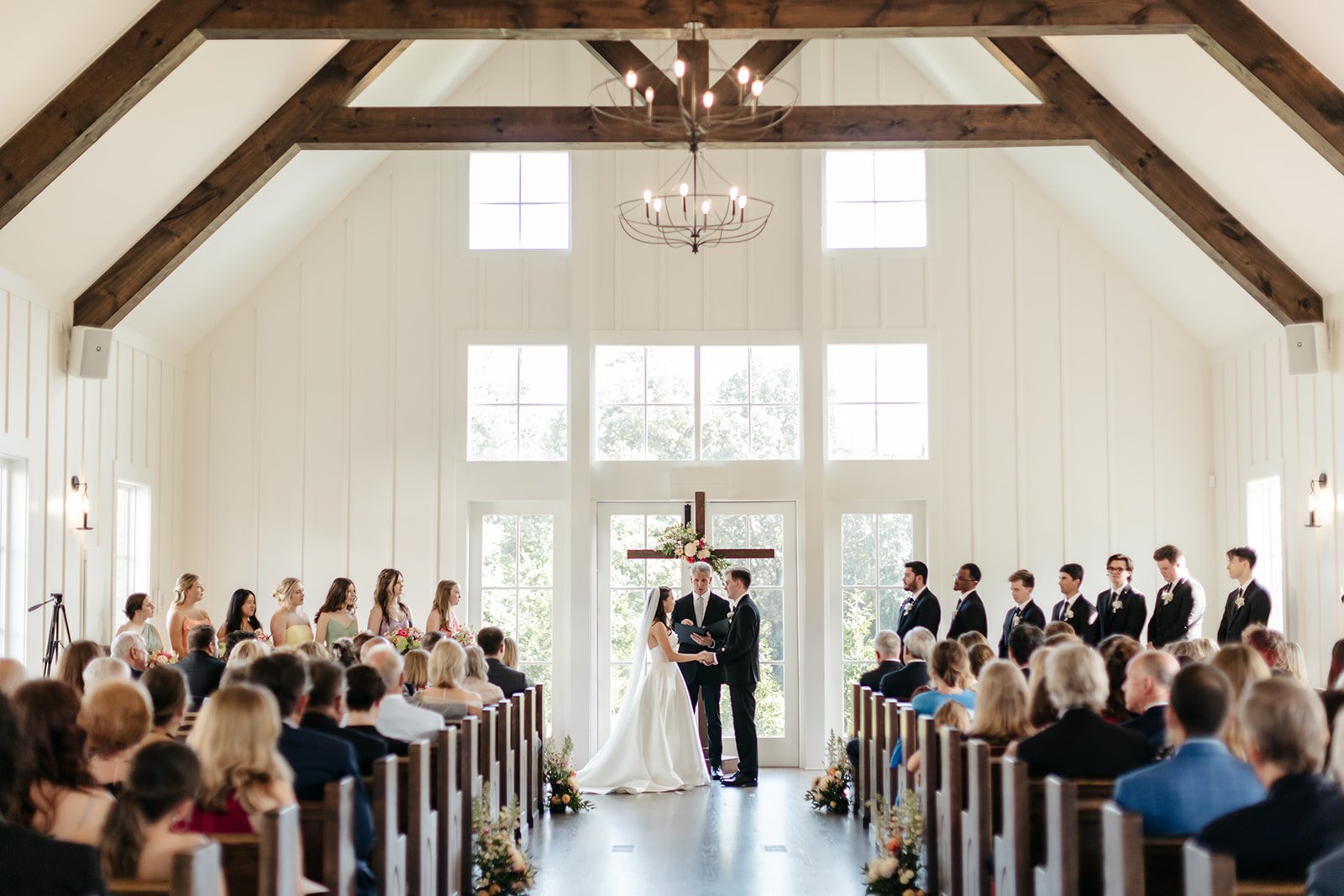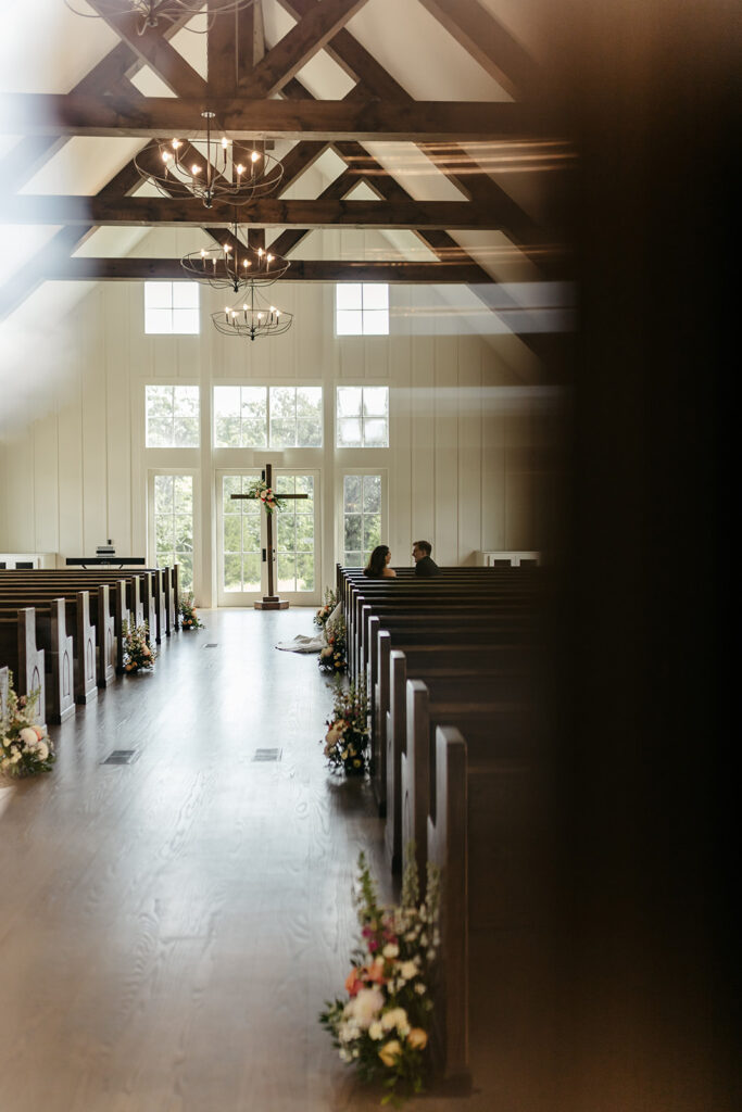 Upon Mary’s arrival, the ceremony began, and at the altar where they were joined in marriage, Hank & Mary’s wedding arbor (a wooden cross honoring their faith) featured a personalized arrangement, bringing together their ceremony space.