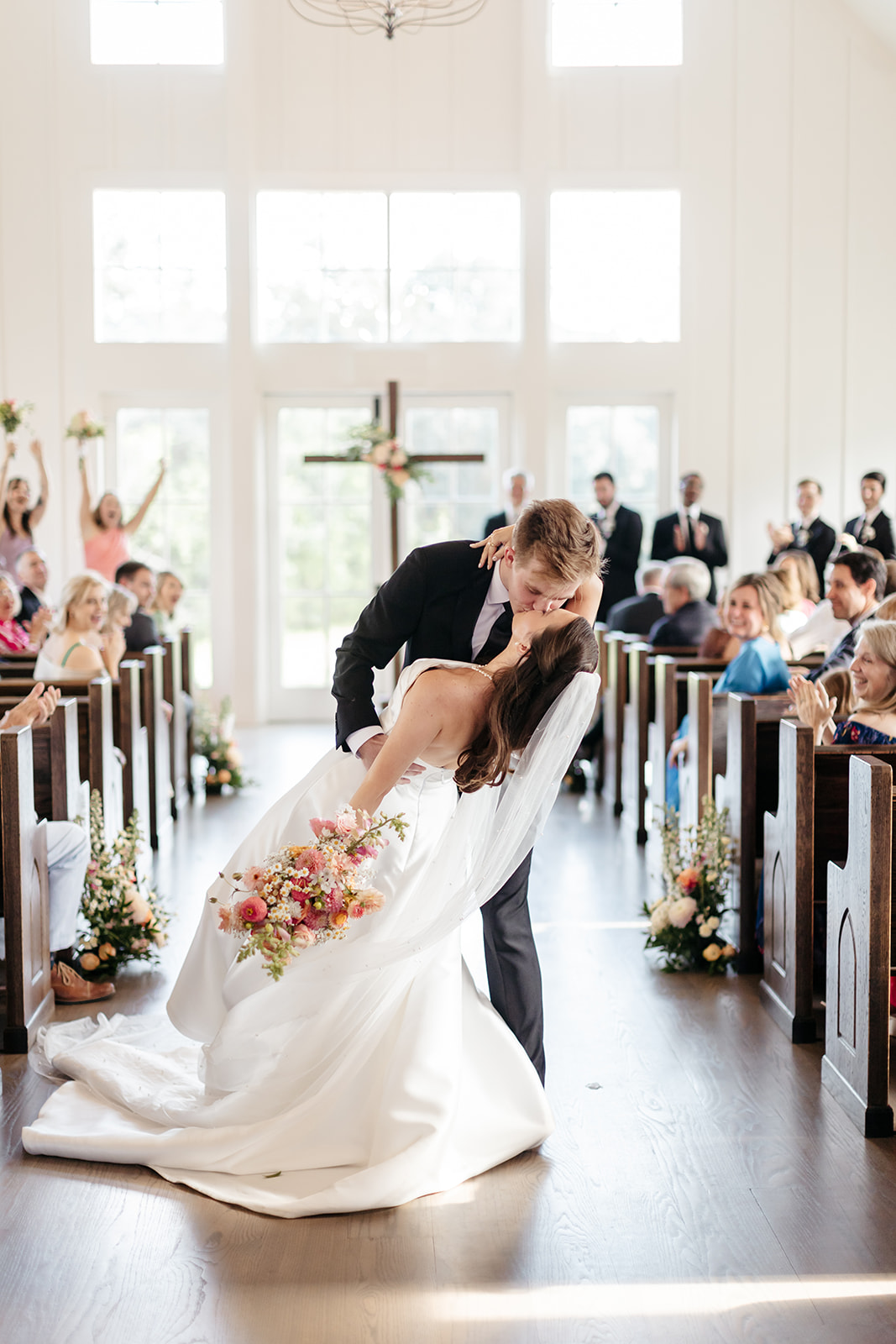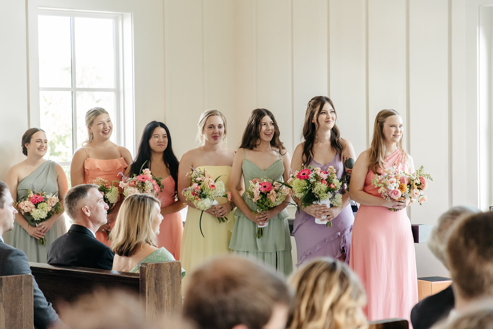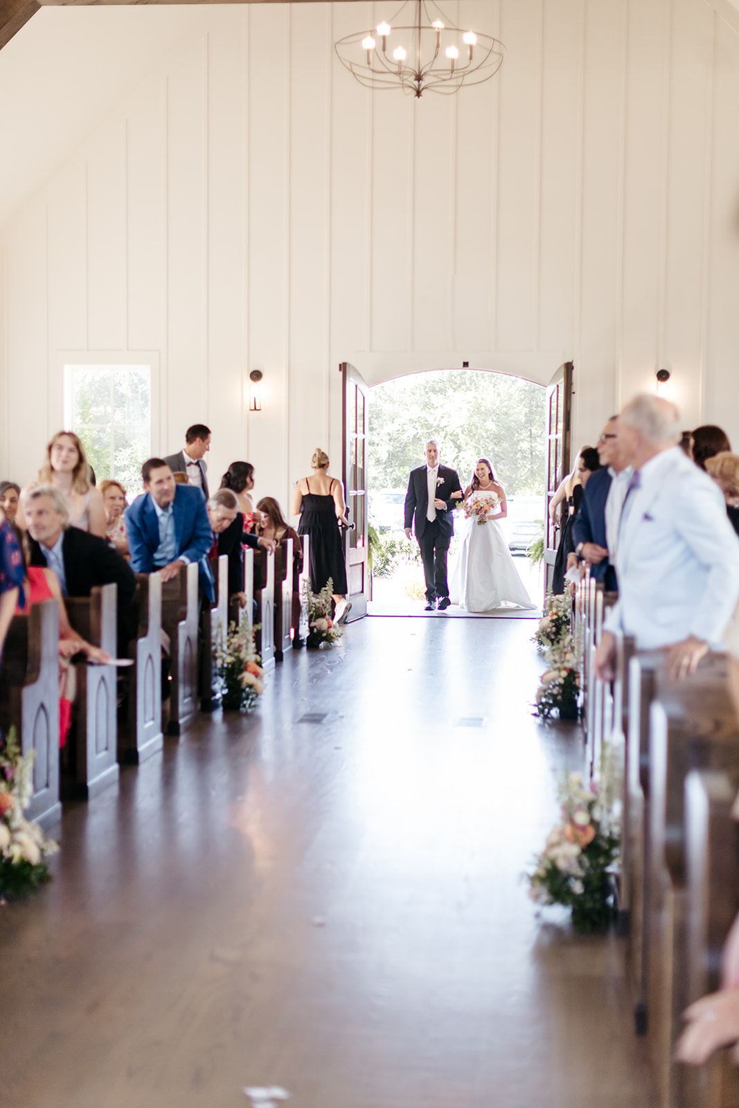 Bouquets of voluminous, brilliantly colored wedding flowers filled the hands of Mary’s bridesmaids as they walked down the aisle, with tall arrangements accenting the pews. But it was Mary’s sweet flower girl who stole the show. Just before Mary arrived, she walked down the aisle sprinkling white flower petals in anticipation of the bride.