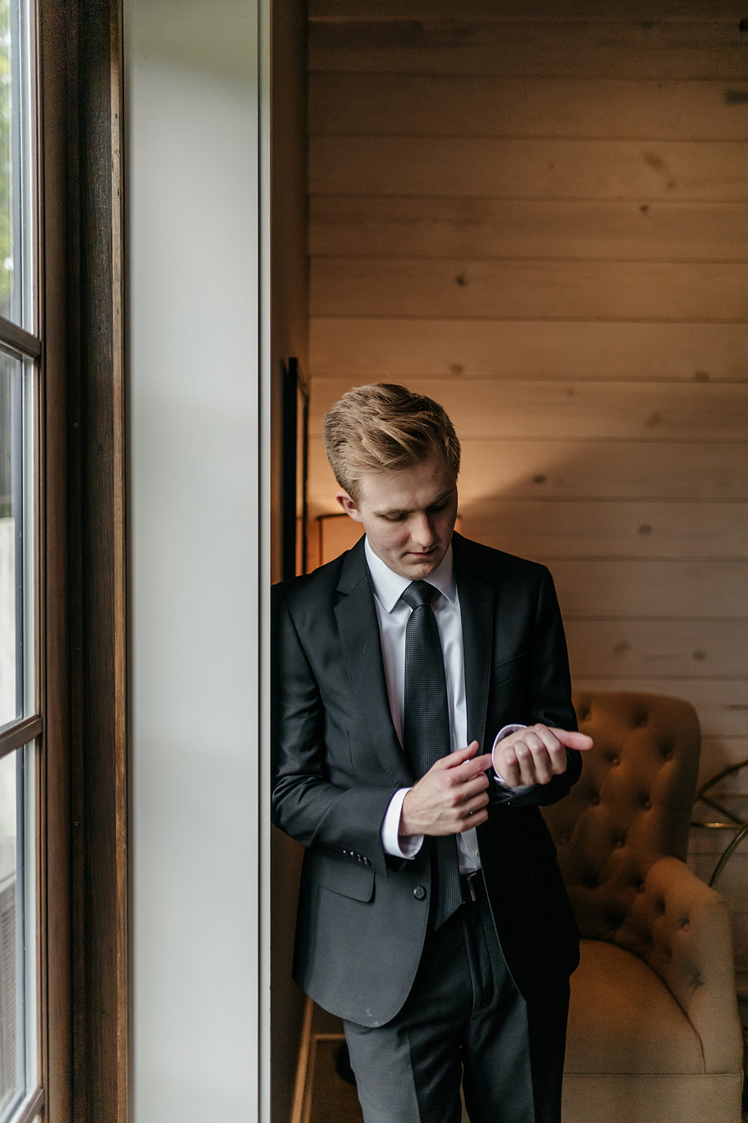 At the very start of the day, while Hank and Mary were applying the finishing touches to their wedding day attire, loose florals were provided to their photographer. This allowed the capture of detailed images, including the couple’s wedding invitation suite and Mary’s bridal jewelry. In a nearby getting-ready suite, Hank and his groomsmen fastened boutonnieres to their lapels in preparation for the ceremony.