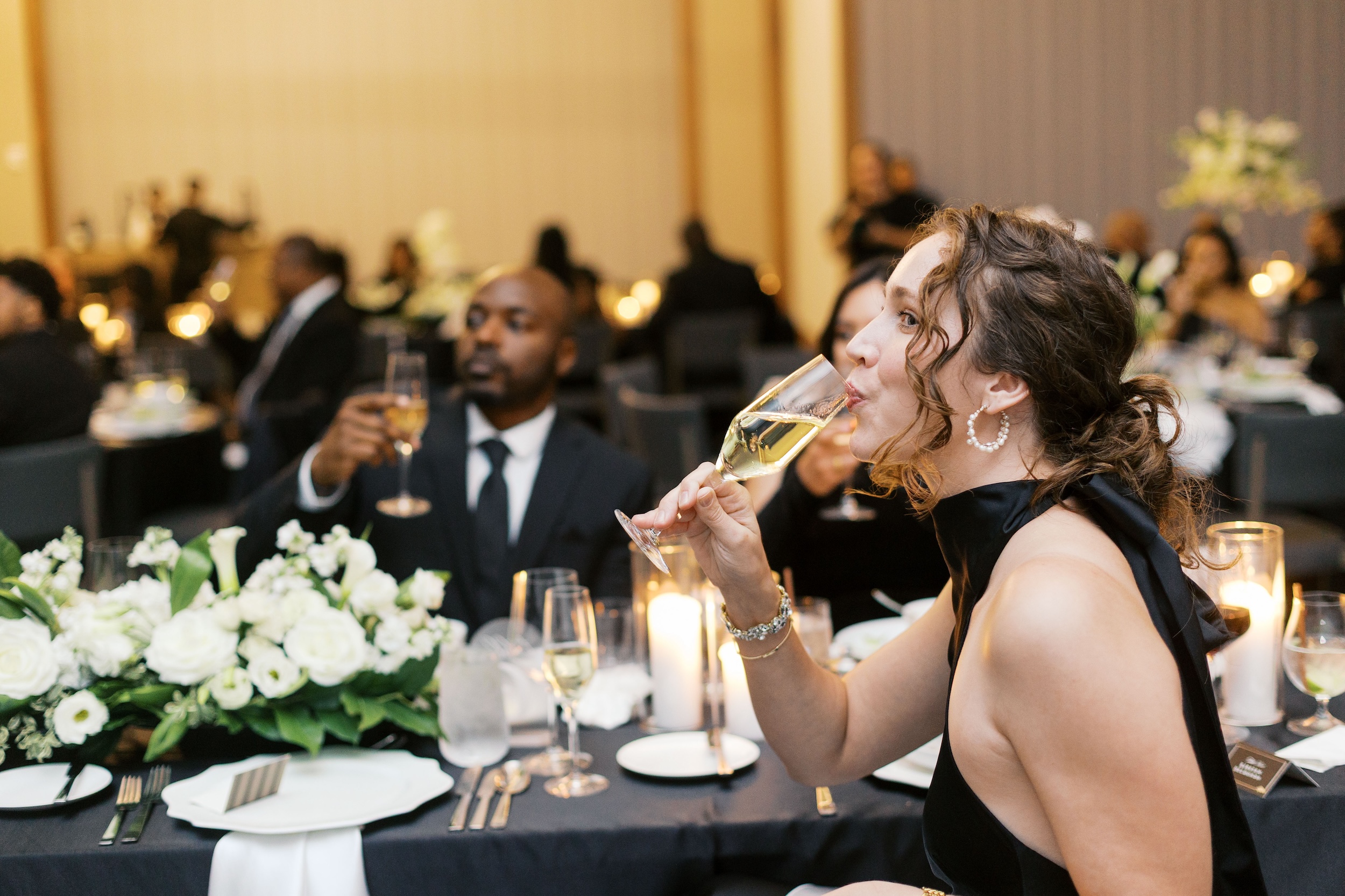 To further enhance their overall wedding day experience and create a cohesive aesthetic amongst their guests, attendees were provided with a dress code for the evening. The request for black attire only added an air of sophistication to Erin & Wesley’s wedding. All the while, producing enchanting wedding day photos depicting elegant design and exuberant guests.