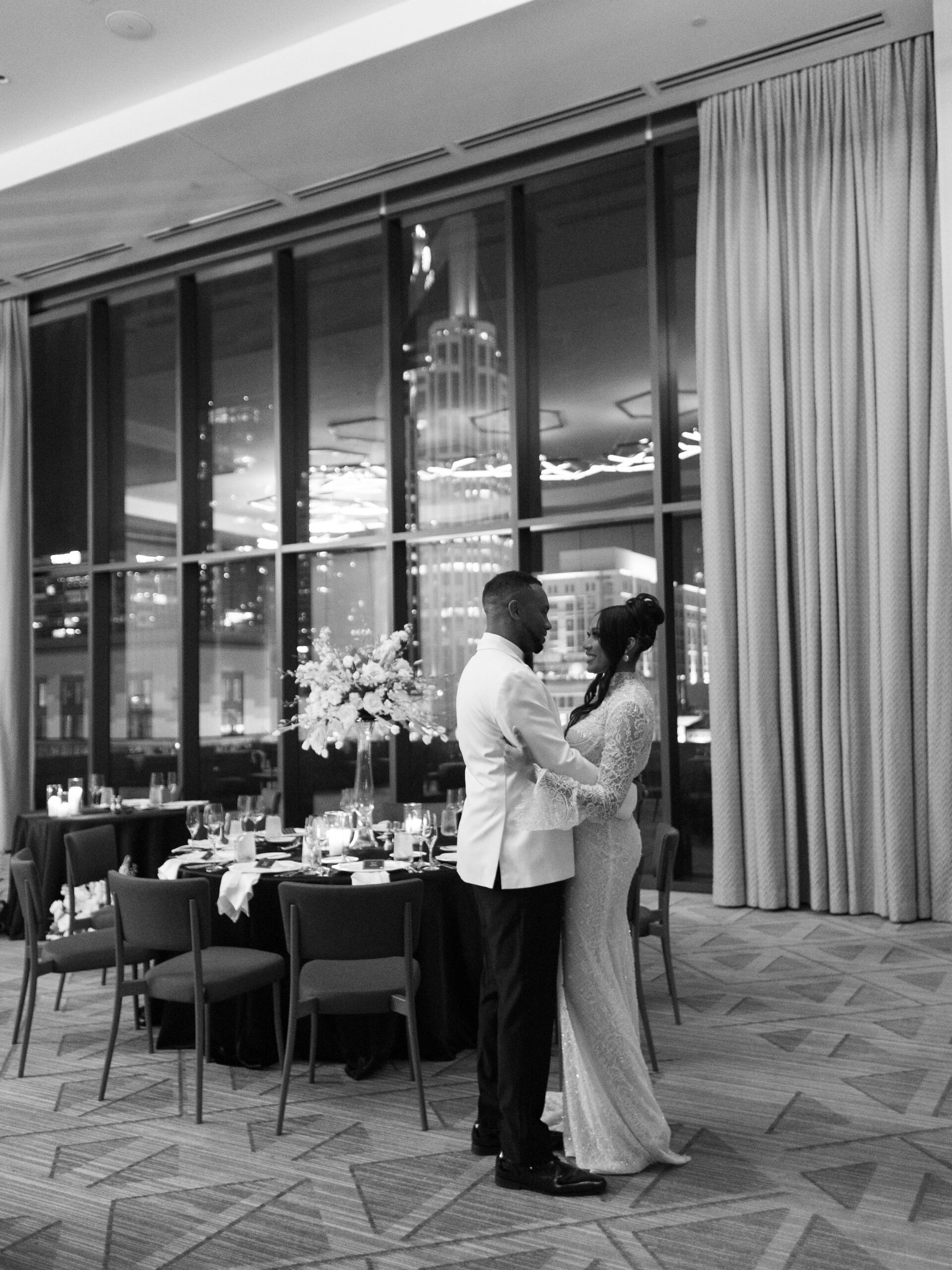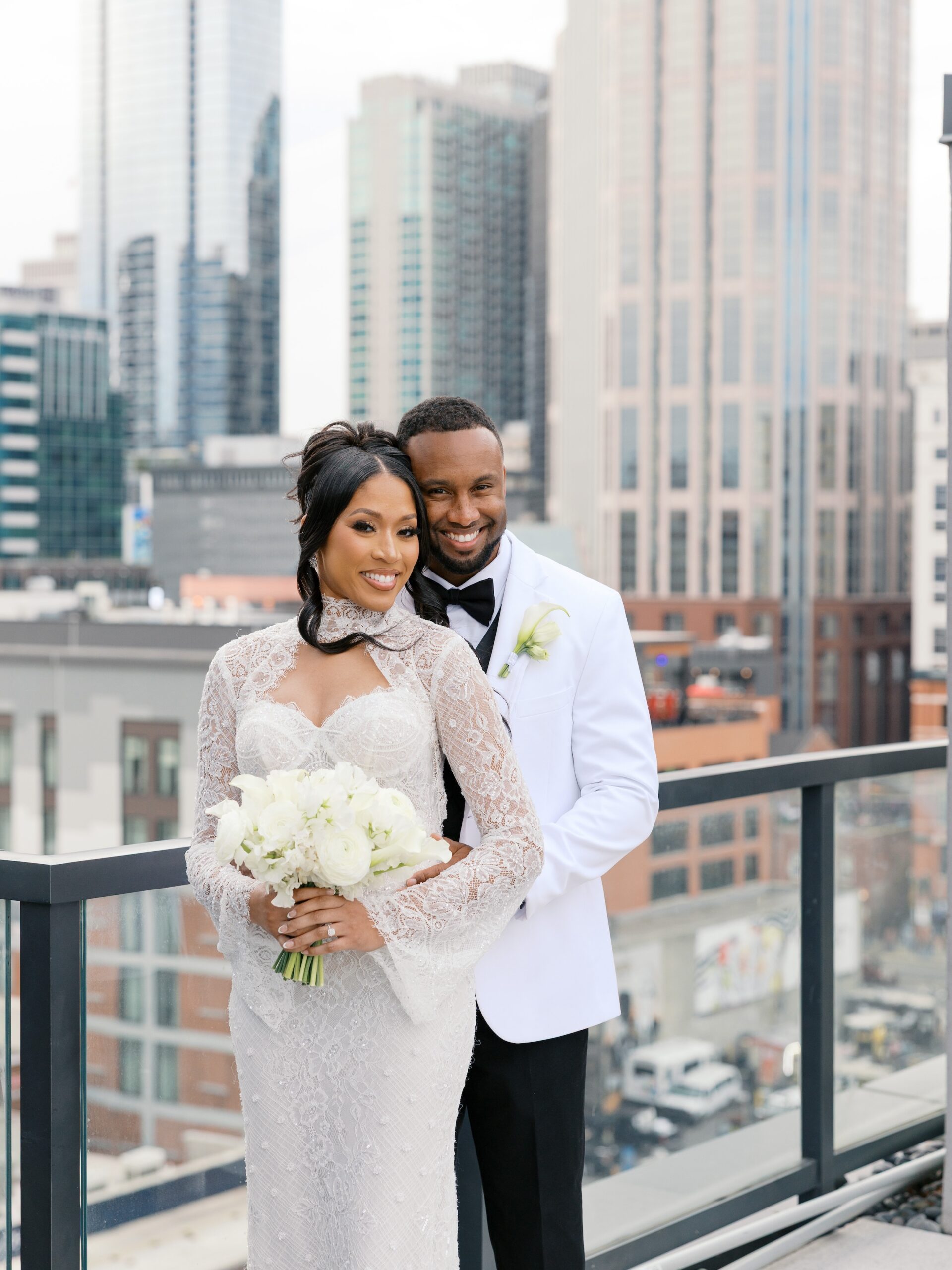 Once accomplished, their choice of venue, color palette, florals, and dress code seamlessly established an unforgettable wedding day experience. It was an evening where the soft sounds of a live saxophone filled the air, friends and family took to the dance floor, and the Nashville skyline blazed bright in the backdrop.